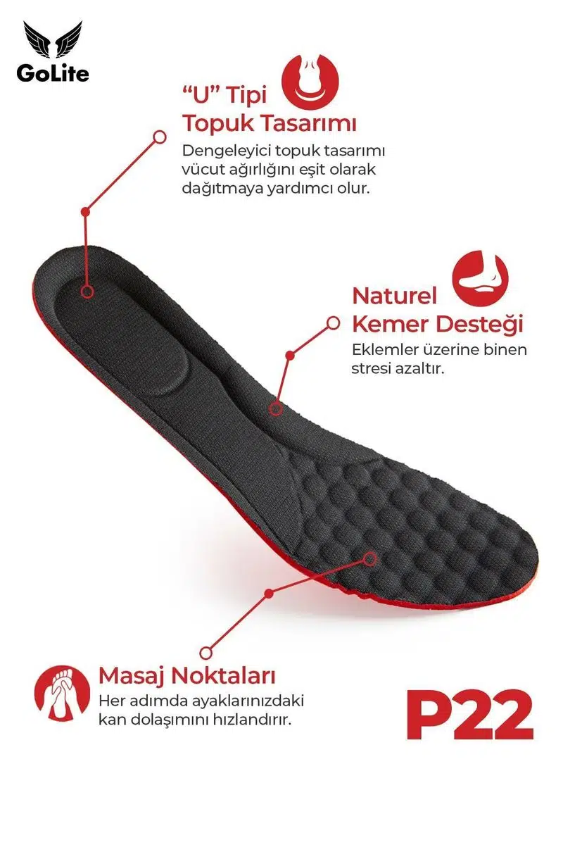 GoLite tabanlık, yüksek kaliteli PU Memory Foam ve nefes alabilen interlok kumaş kullanılarak üretilmiştir. Bu sayede sadece konfor sağlamakla kalmaz, aynı zamanda ayağın hava almasına yardımcı olarak terlemeyi ve kötü kokuları önlemeye destek olur. Hafızalı sünger yapısı sayesinde ayağınızın şeklini alarak kişiye özel bir uyum sunar ve uzun süreli kullanımda bile rahat bir deneyim sağlar.